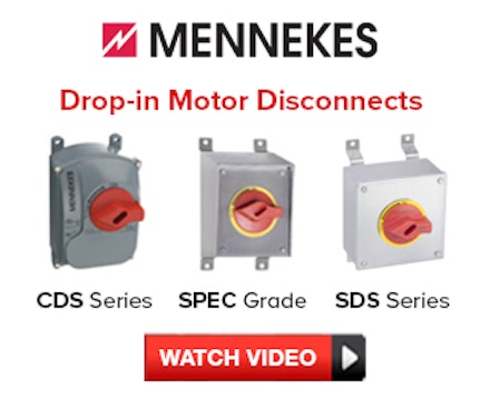 |  |  | | | Advertisement | | It’s never been easier to upgrade your facility with motor disconnects that prioritize sanitation, promote safety and minimize installation time with footprint compatibility. With an industry-standard mounting pattern, MENNEKES 30A CDS, SPEC Grade and SDS switches are true drop-in replacements. |