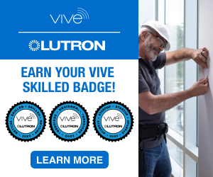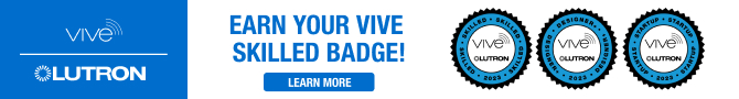 |  | Advertisement | Earn Vive badges and let your customers know they are hiring a trained expert in Lutron wireless control systems. Available and in stock at most electrical distributors, Vive is simple and scalable for code-compliant control on commercial jobs. |