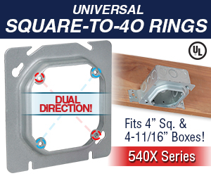 | | Sponsored | | Orbit's 540X Series transitions a standard square box into a 4O (3-1/2" O.C.) opening. Key hole slots fit 4” and 4-11/16” boxes. Four mounting tabs allow for dual-direction mounting of fixtures. Available in 5/8” thru 1-1/4” raised configurations. 16 GA steel. UL Listed. |
