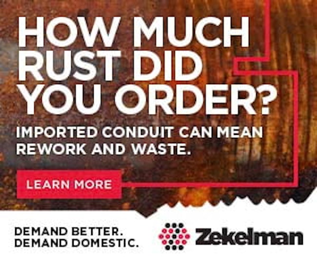| | Sponsored | | Rust. Corrosion. High or sharp seams. Kinking when bending. Too often, what you get with imported conduit is frustrated crews and time and money lost on the job. Choosing domestically manufactured conduit means choosing quality for your customers, better working relationships and fewer headaches for your company. See all the ways domestic conduit, EMT and EC&N can save you time and money. |