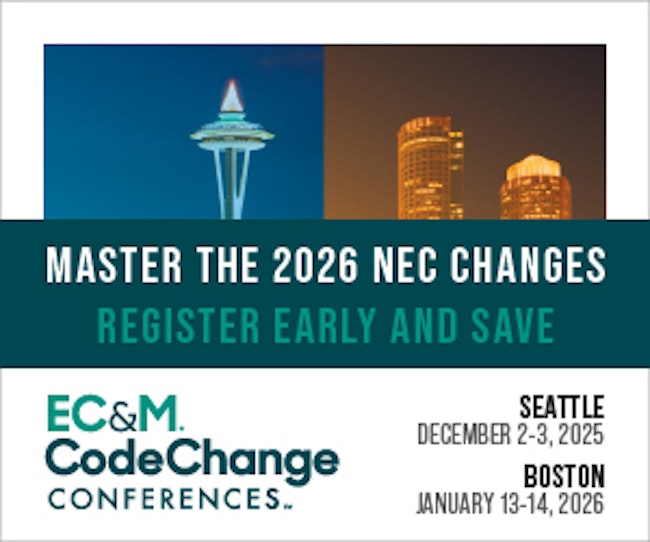 | | Sponsored | Join EC&M’s Code Change Conference this December in Seattle or January in Boston. Two days of expert-led training to keep electricians, contractors, inspectors, and engineers up to speed on major NEC updates. |